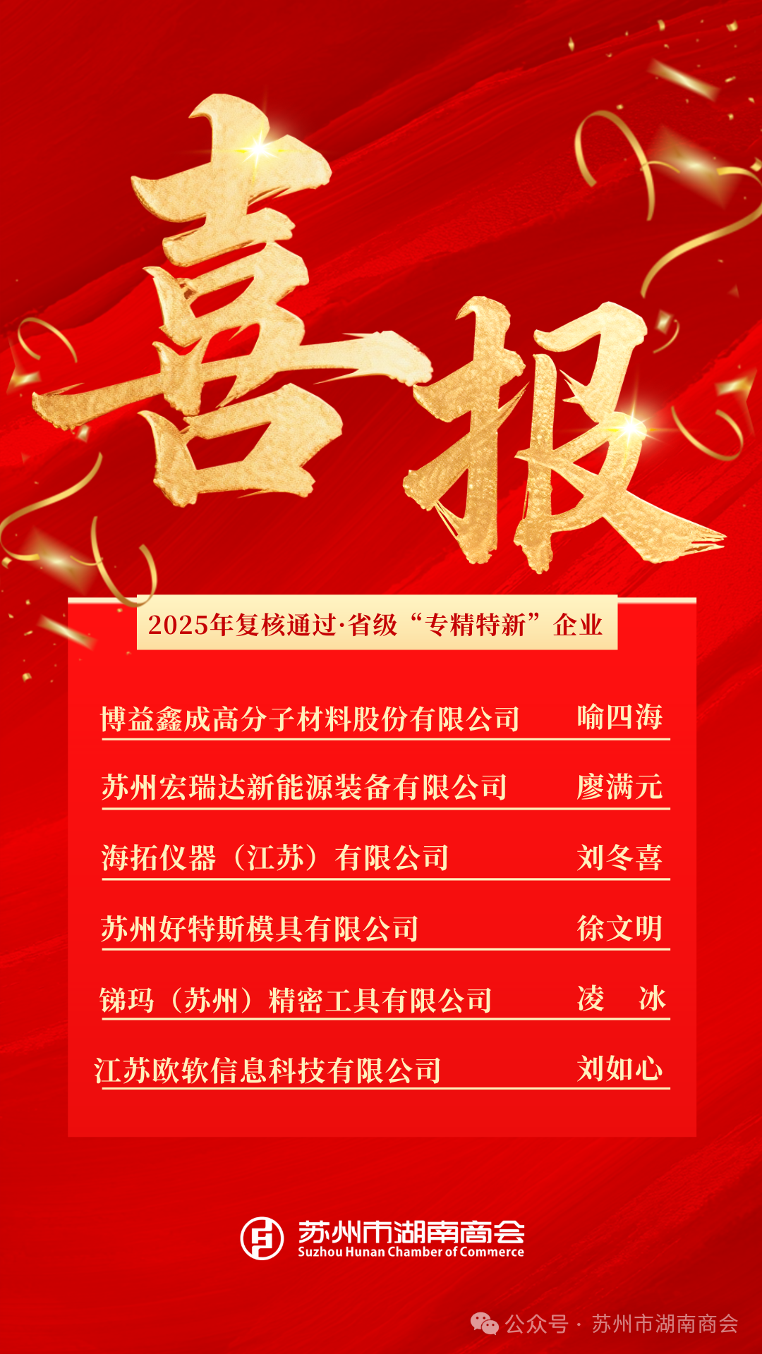 近日,江苏省工业和信息化厅对 2025年度省级专精特新中小企业(第二批)认定名单及复核名单 进行了公示。