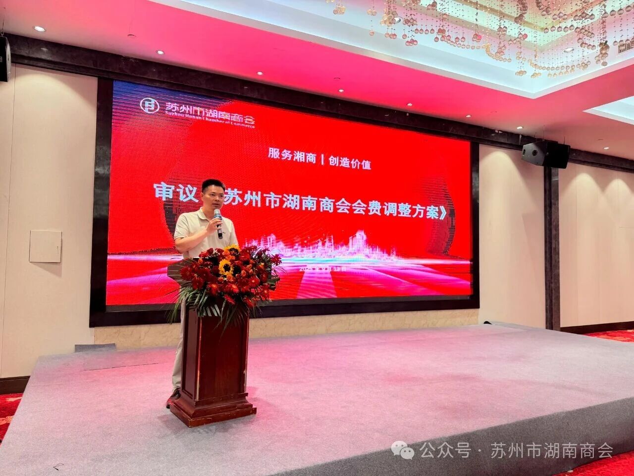 党支部书记谭建华就《苏州市湖南商会会费调整方案》的内容向大会作了详细说明。本次会议重点审议并表决通过了《苏州市湖南商会会费调整方案》,该方案旨在优化会费结构,更好地保障商会各项服务工作的可持续开展与高质量运营,为会员提供更有价值的服务,会议决议将2026年度会员会费由1000元/家调整为2000元/家,同时,参考其它商会普遍情况,监事会费由1000元/家调整为5000元/家。