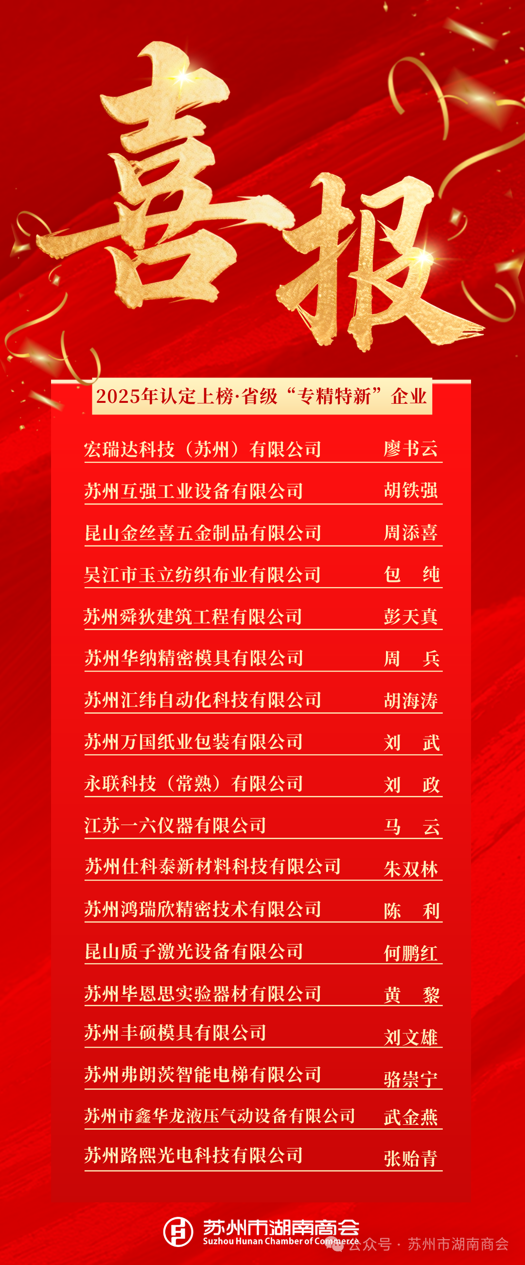 近日,江苏省工业和信息化厅对 2025年度省级专精特新中小企业(第二批)认定名单及复核名单 进行了公示。