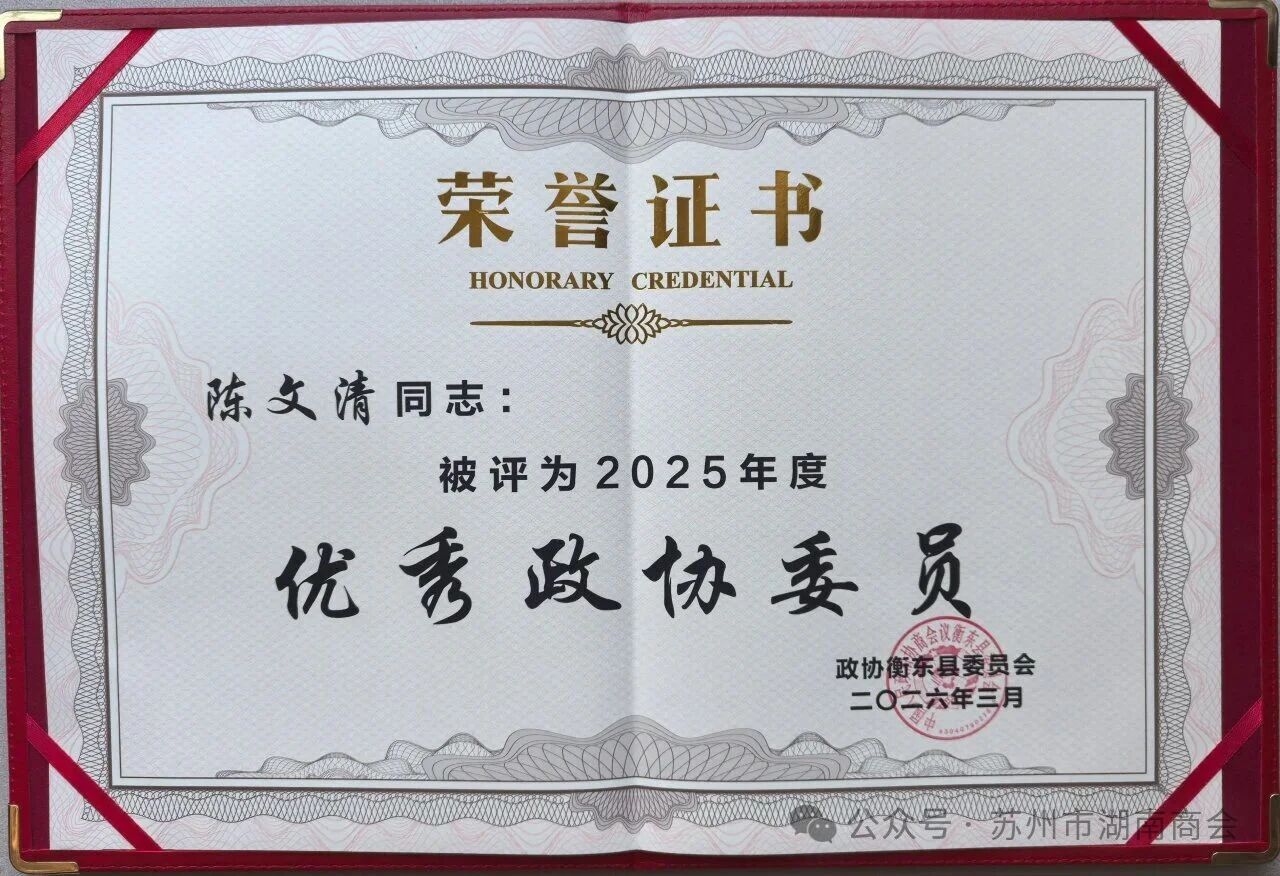 近日,从湖南省衡东县传来喜讯,苏州市湖南商会常务副会长陈文清荣获政协衡东县第十五届委员会2025年度“优秀政协委员”称号。