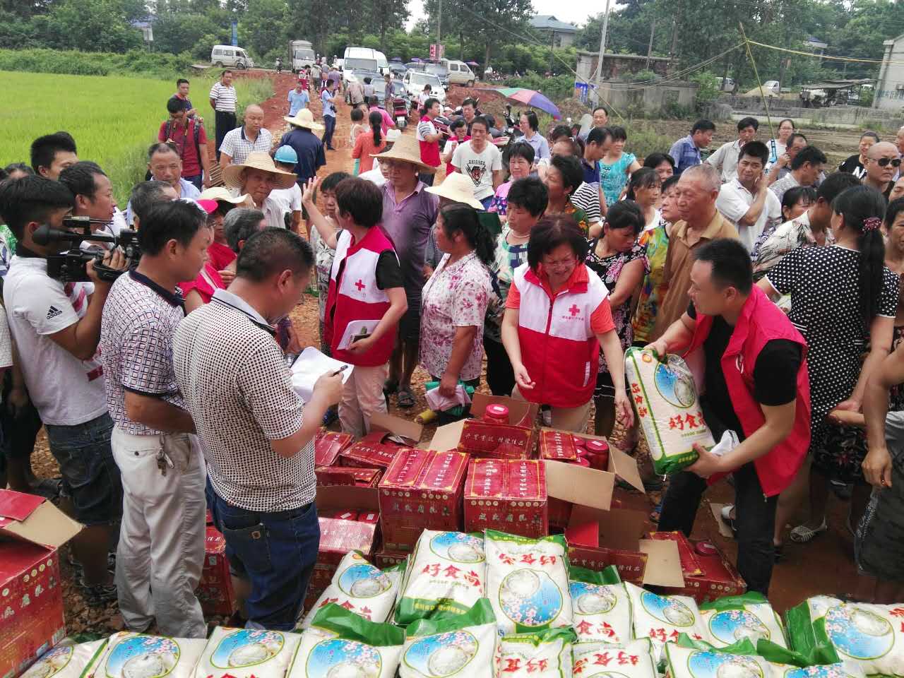 4日上午十点,在益阳受灾最为严重的泉交河镇,湖南省红十字会党委书记陈丹萍代表受灾群众接受了捐赠物资,并和志愿者一同将物资发放到受灾群众手中。